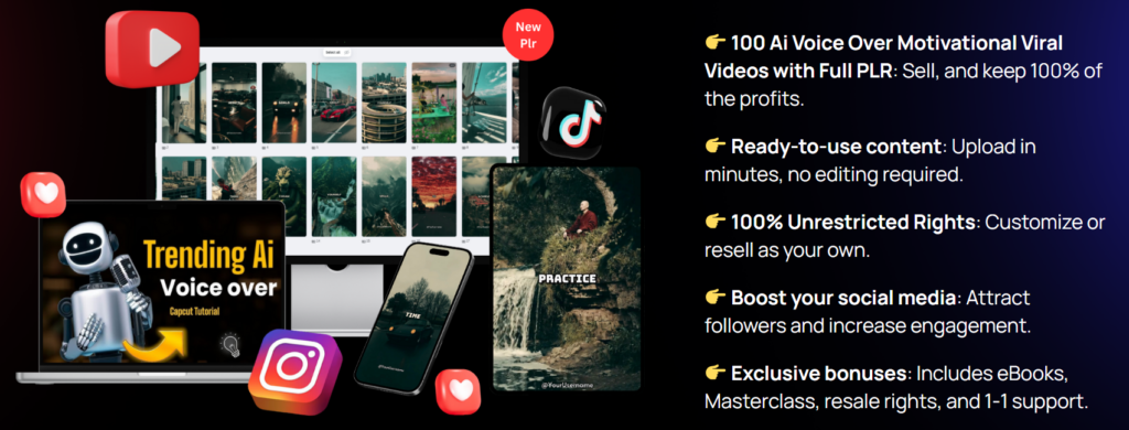 BONUS: If you purchase Ai Voice Over Motivational Viral Video through the link in this article, you’ll receive a free $100k bonus. This bonus includes exclusive resources and tools to further enhance your content creation journey. Don’t miss this incredible opportunity to elevate your videos to the next level!